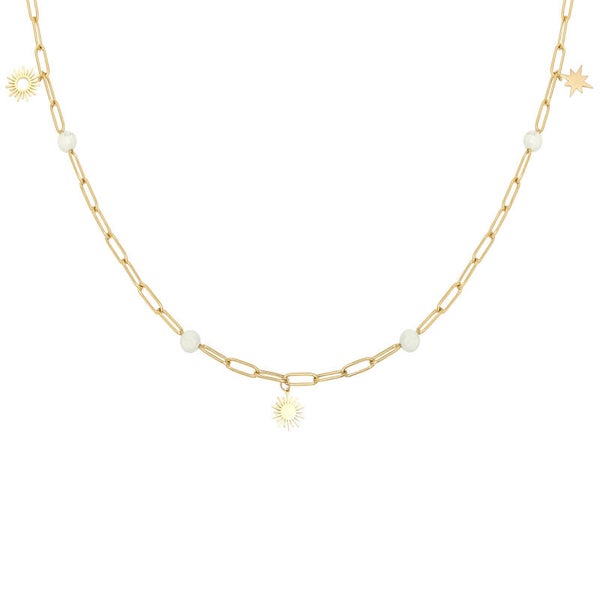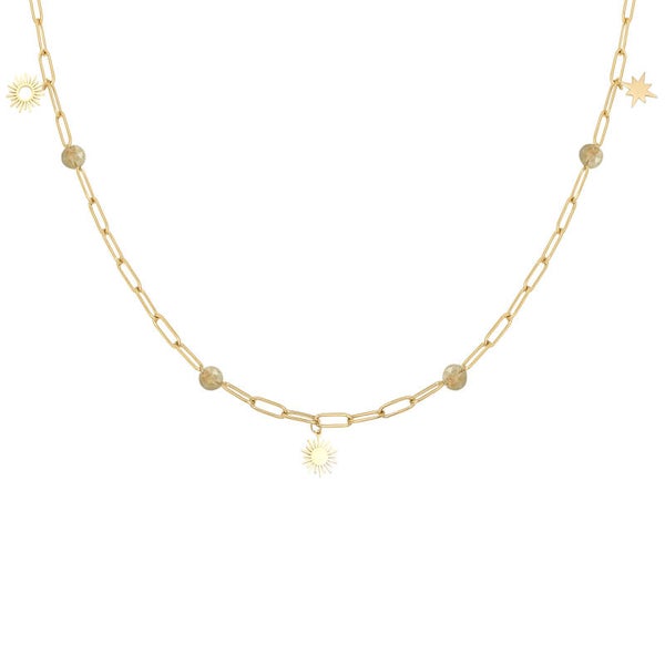 Ketting met meerdere bedels en natuursteen. Verkrijgbaar in verschillende kleuren.